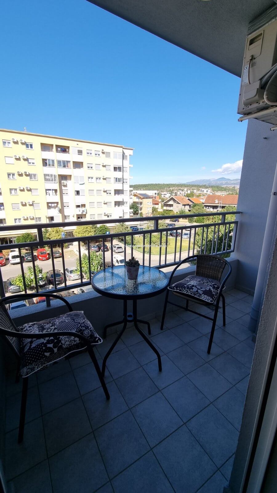 The apartment is fully, very nicely furnished. There is a large public parking lot around the building.