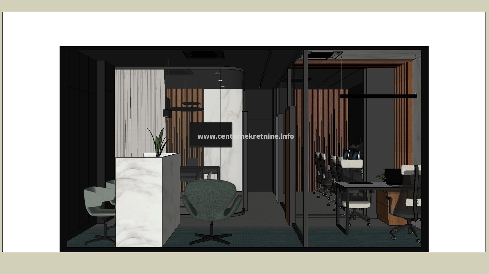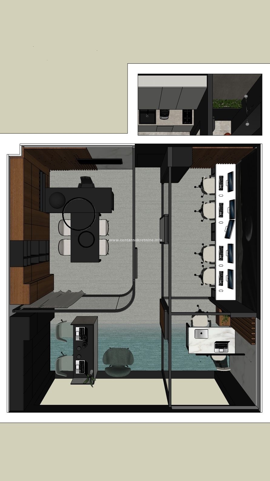 Infrastructure is prepared for 9-13 workstations, with installed video surveillance, distributed sound system, 4 ceiling-mounted inverter air-conditioning units.