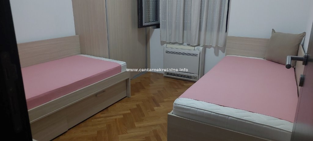 Izdaje se prostran dvosoban stan na odličnoj lokaciji u Bloku VI, u blizini Osnovne škole "Radojica Perovič."