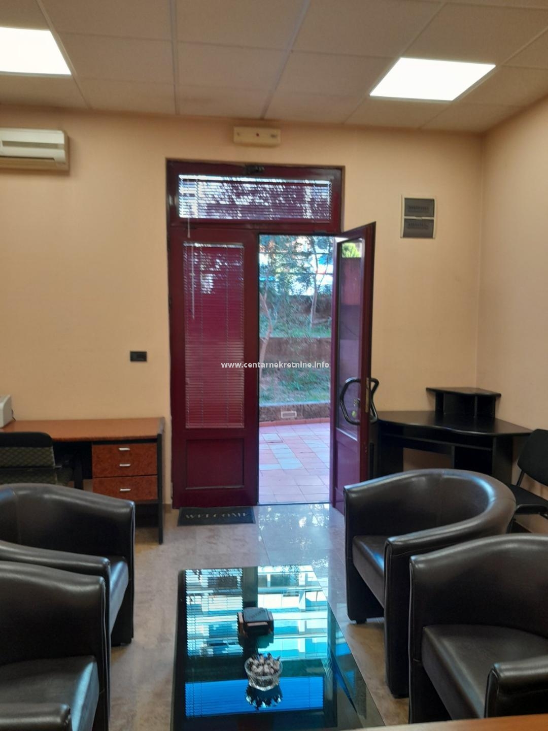 Prostor je kompletno opremljen kancelarijskim namještajem - 3 radna stola i klub garnitura sa stolom.